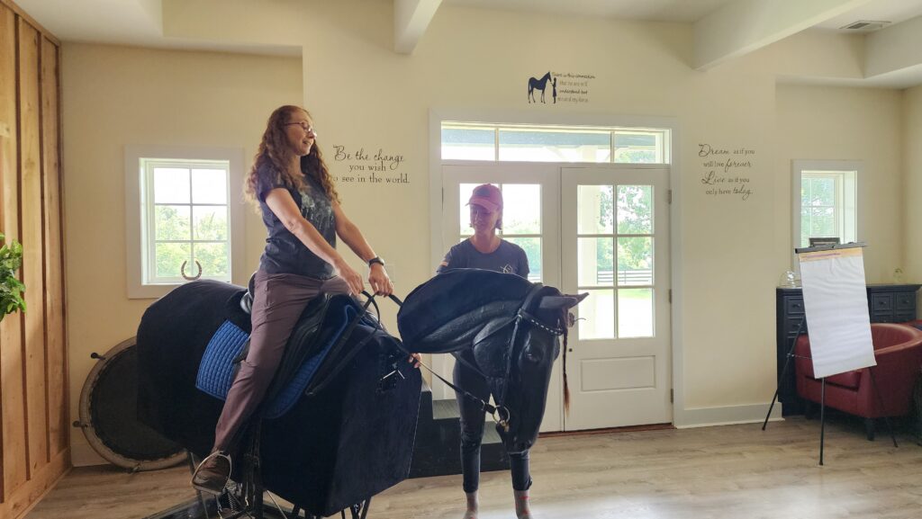 The final session was with Shelby F. She shared exercises which help remove tension in your body starting with your toes, and how this affects rein contact. Riding Harmony the mechanical horse showed me how rider position, pelvic tilt, or any small change can affect the horse.